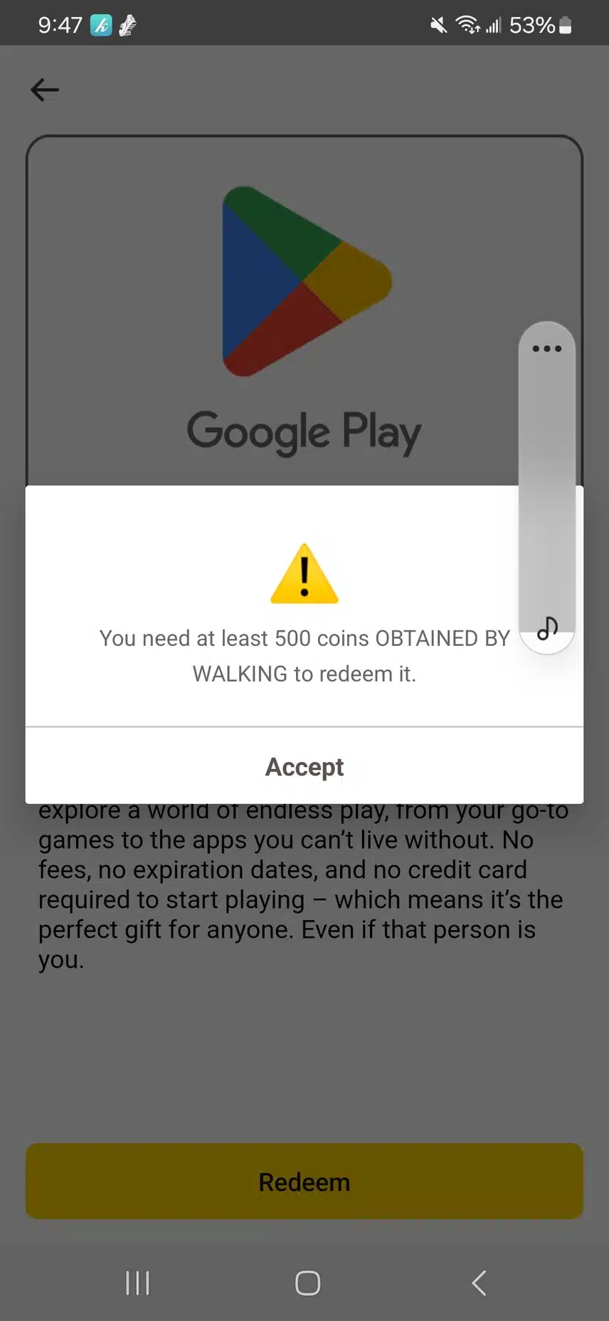 Samantha BoveeIt says that the first time you redeem if you need more coins from walking. Just walk more and it should go away in a day or 2