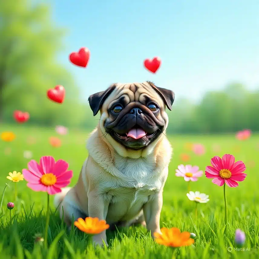 Pug Around Flowers And Hearts